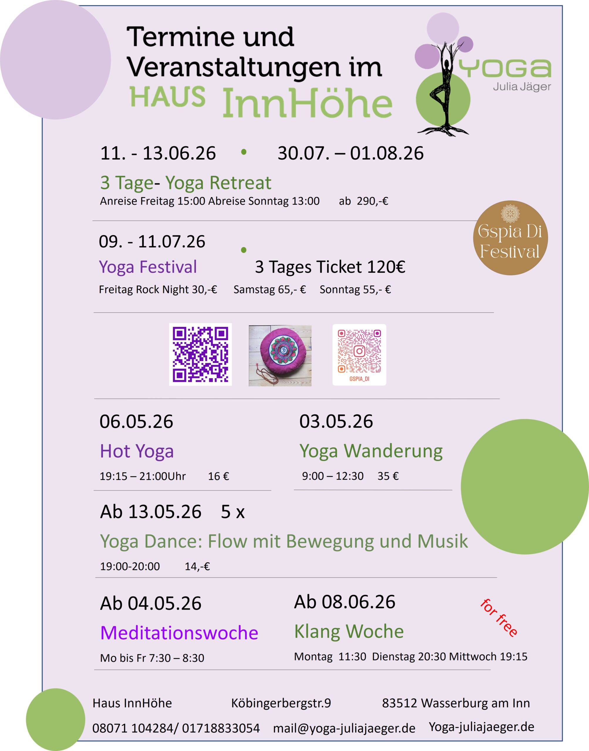 „Lichtdurchflutet und mit einem reizvollen Blick auf Garten, Naturteich und Meditationsgrotte präsentiert sich das Haus InnHöhe mit dem Yogastudio. Hier hat Julia Jäger einen Ort geschaffen um der Seele Raum zum Atmen zu geben. Neben verschiedenen Yoga Stilrichtungen kommt man hier in den Genuss von herrlichen Massagen und Wellnessanwendungen. Die Räume strahlen Wärme und Ruhe aus. Es gibt einen knisternden Kamin, zwischen antiken Säulen brennen Kerzen, sanfte Klänge schmeicheln dem Ohr und es duftet verführerisch nach Gewürzen. Durch Julias Ausbildung zum Heilpraktiker sowie Ayurveda, Reiki und Feng Shui Kenntnissen ergibt sich ein ganzheitliches Konzept.“